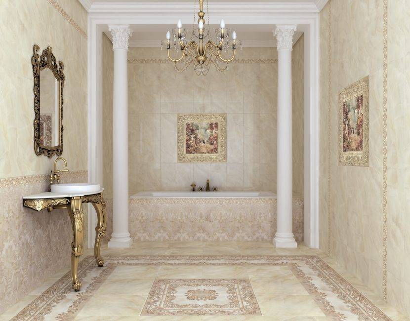 Сочетание в одном интерьере плитки для настенной отделки и их напольных вариантов, создает единое стилевое решение. Каждая коллекция отличается собственным, присущим только ей орнаментом. Зачастую, на отдельных плиточных фрагментах можно встретить абстрактные мотивы фантазийного характера из жизни растений и животных. Весьма интересны расцветки с имитацией тканого материала в тематике Византийского периода и ажурные поверхности с воздушным плетением. Впечатляет плитка с рисунком в духе средневековой геральдики.