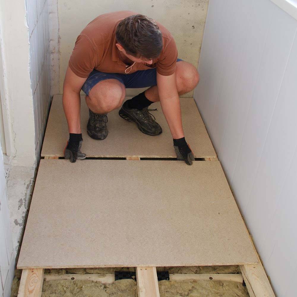 - Сначала кладут длинный фанерный лист. Если на основании уложены поперечные лаги, то первоначально фиксируют лист на ребре, продвигая его вплоть до окончания лоджии, а потом отмечают месторасположения поперечных лаг.