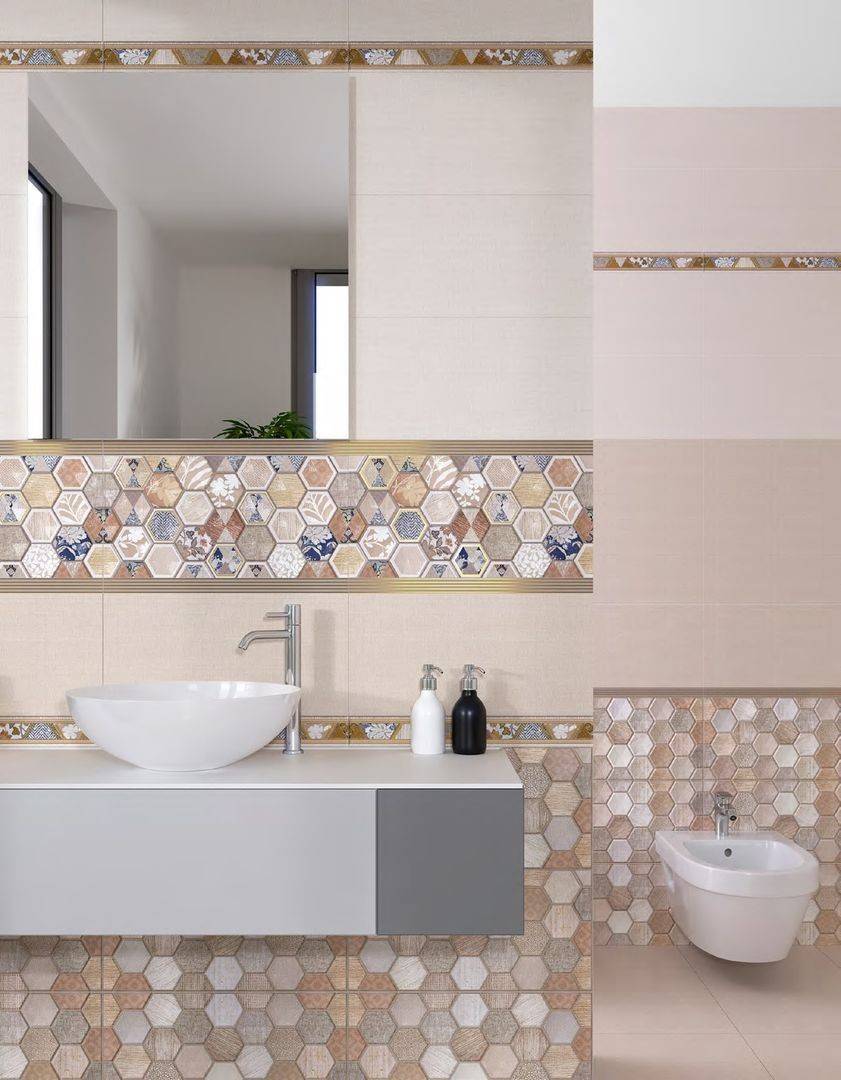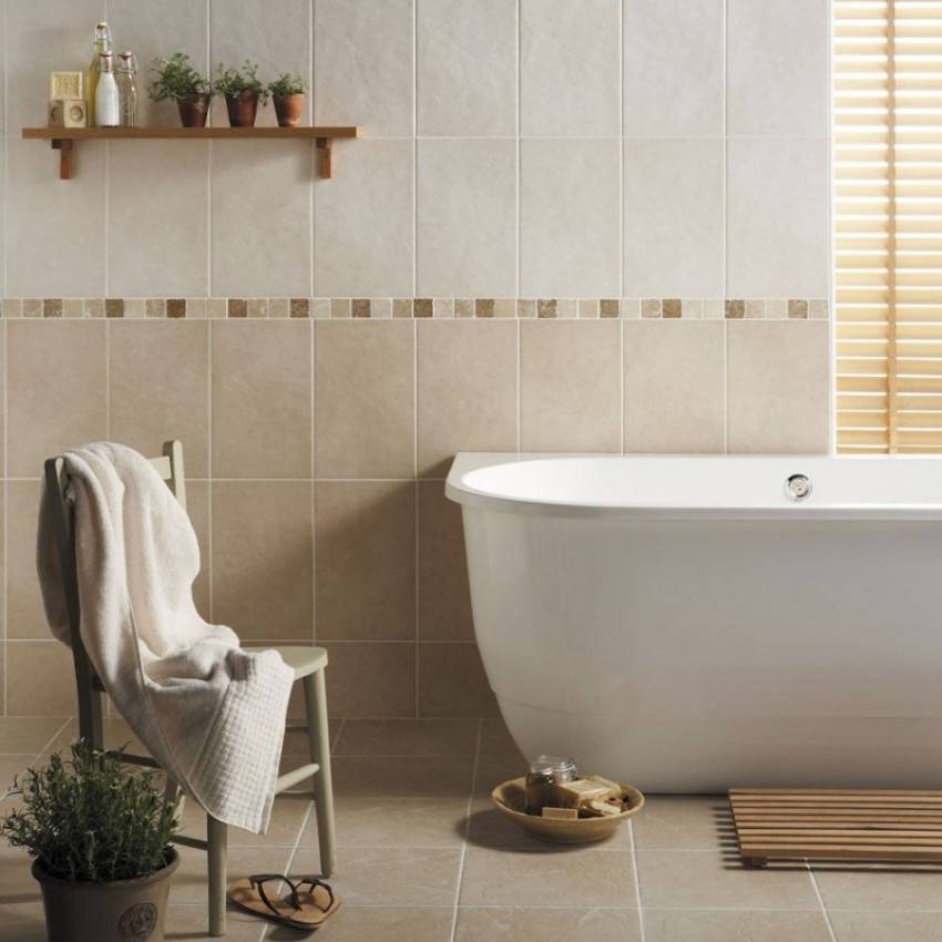 Большое количество декоративных бордюров и фриз оптимально для широких ванных комнат.