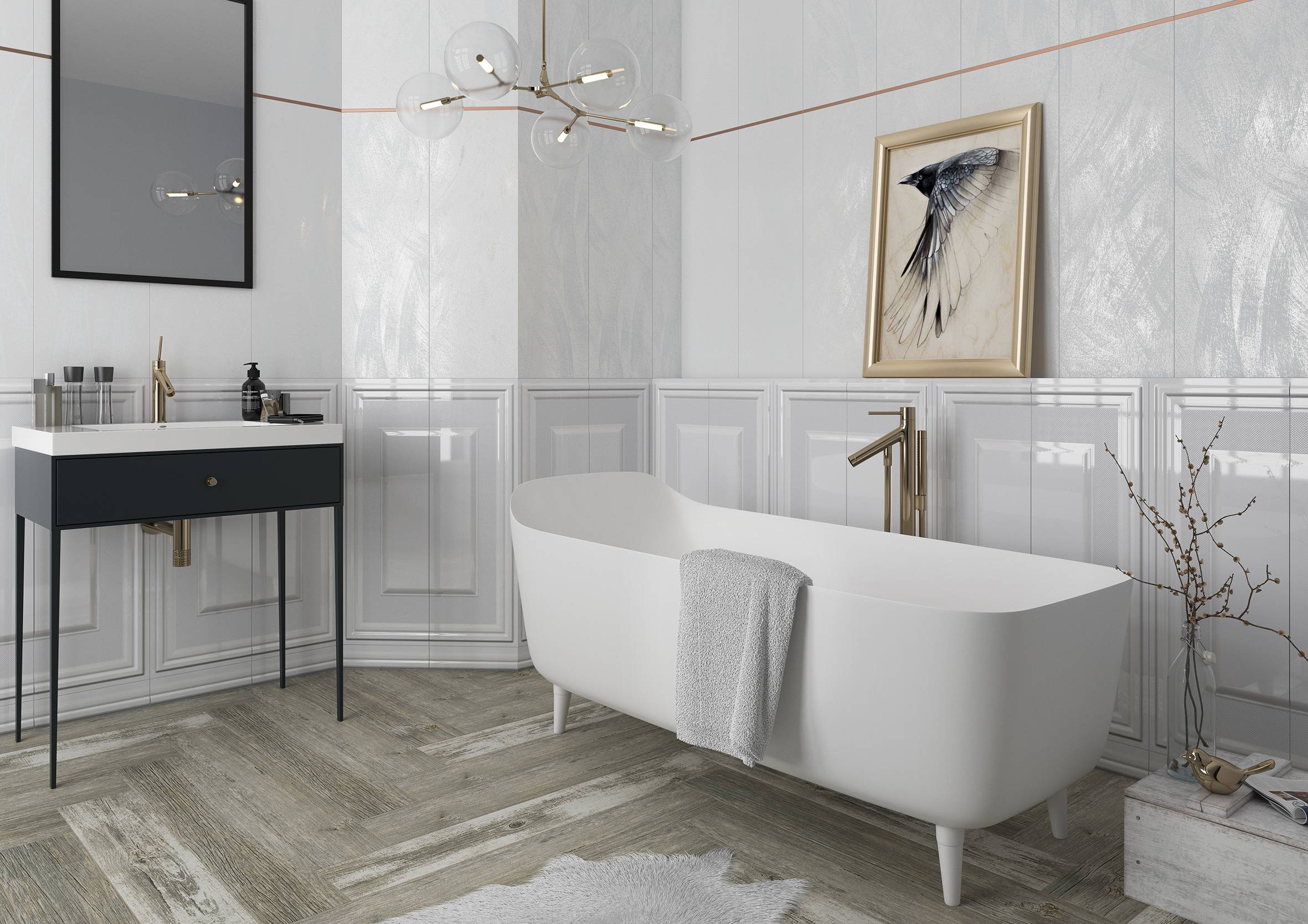 Идеальный вариант для ценителей натуральности и свежести. В качестве доминантных цветов коллекции дизайнеры использовали молочный, серый и оттенки зеленого (светло и темно-зеленый). Плашки украшают утонченные полосы разной толщины и растительная тематика. Такая плитка способна создать в помещении природную и воздушную обстановку.