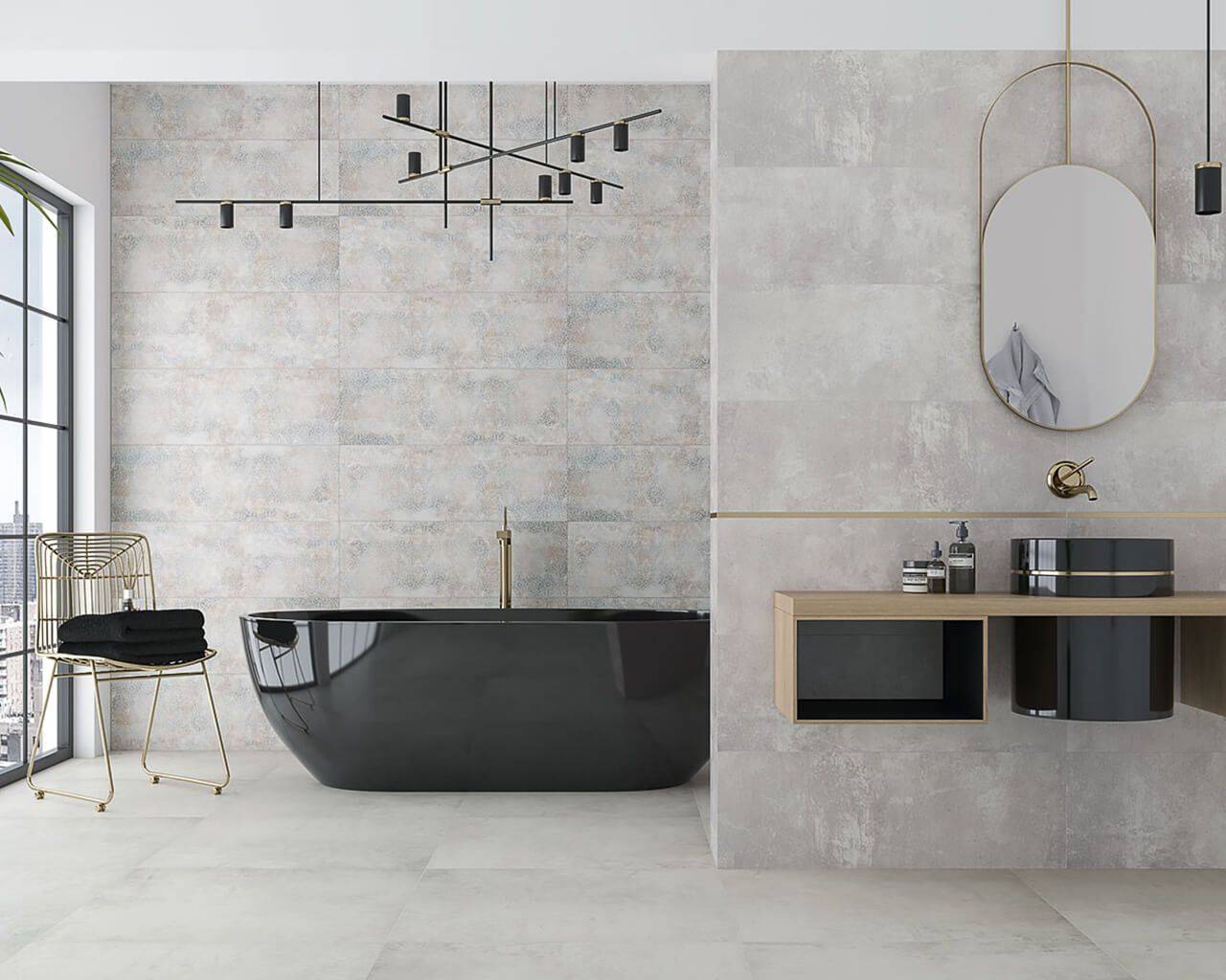 Эта керамогранитная плитка была создана как покрытие для пола, но внешний вид ее таков, что ее можно смело использовать и для стен. Рисунок напоминает не то природный камень, не то разводы патины на поверхности из меди. Такие оттенки считаются благородными, в то же время они – природные, поэтому отлично подойдут для интерьеров в стилях: