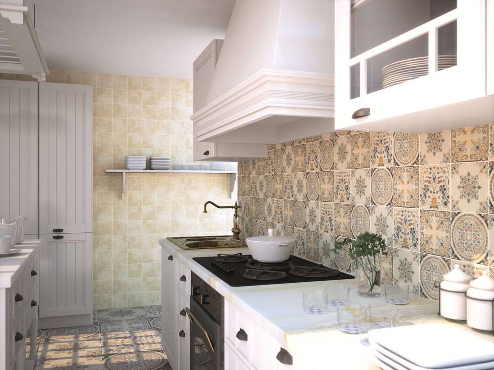 В этом стиле применение лоскутной техники выглядит наиболее естественно. Допустимо использование монохромных орнаментов, а также многоцветной плитки patchwork, однако для кухни часто используют многоцветные для дополнения художественного образа.