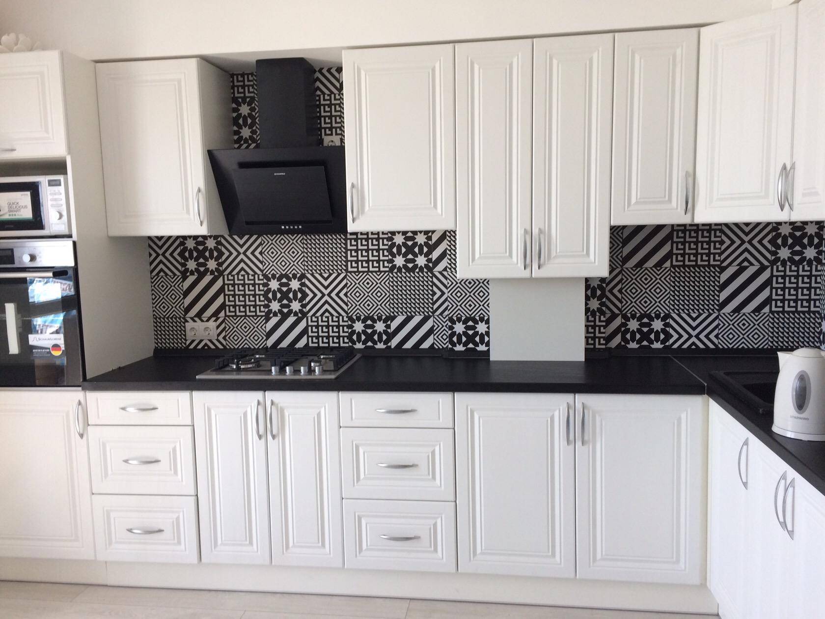 Очень элегантно выглядит фартук, оформленный черной глянцевой плиткой. Но и тут существенным недостатком является то, что на нем видны даже малейшие пылинки, не говоря уже о каплях воды, жира и отпечатках пальцев.