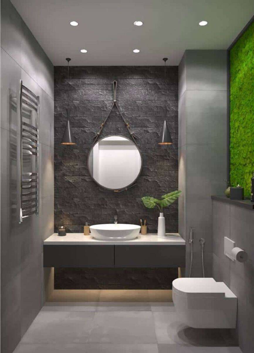 Для создания такой образа используются крупные плиты на полу и стенах или кафель под дерево, приглушенных оттенков белого, серого, бежевого. Завоевали популярность варианты с расцветкой под бетон.
