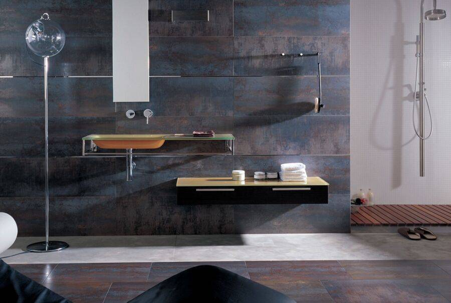 Плитка, имитирующая гладкий полированный металл — практически всегда глазурованная. Ее следует использовать для отделки стен. А вот керамогарнит, похожий на покрытые ржавчиной листы, обычно структурированный и имеет зернистую поверхность. Он подойдет как для стен, так и для пола ванной или гостиной.