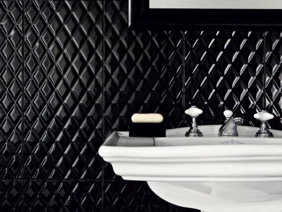 Для многих черная керамика может показаться очень тяжеловесной для интерьера. Но дизайнеры в этом сезоне предлагают много проектов, в которых она интересно обыгрывается. Варианты под черный мрамор используют для отделки душа.