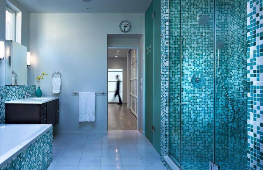 При выборе цвета отделочного материала большинство выбирает плитку голубого, бирюзового или бежевого цвета. Грамотно подобранное сочетание оттенков позволяет добиться поразительных результатов в небольших по площади помещениях. Белая мозаика для ванной пользуется не меньшей популярностью, так как хорошо сочетается со всеми цветами.