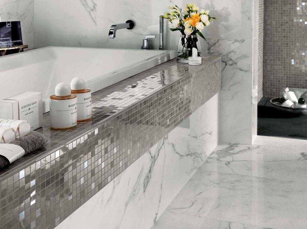 - матовая и лапатированная плитка под мрамор текстура которой обладает нескользящей поверхностью – наиболее оптимальный вариант для выполнения работ по отделки ванной комнаты и прочих помещений с повышенным уровнем влажности.