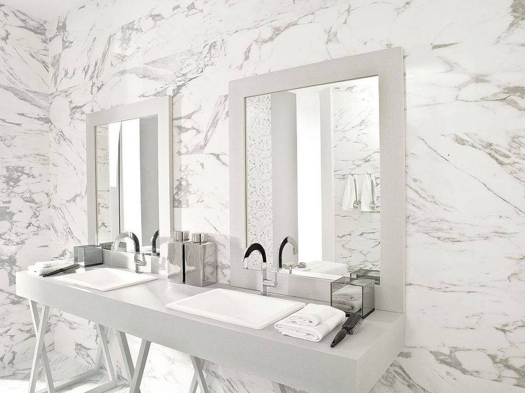Не рекомендуется облицовывать рабочие поверхности, стены и особенно пол чисто белым мрамором. Он самый сложный в уходе и из-за цвета, и из-за структуры. Его можно использовать для изготовления сантехники, мебели и декоративных элементов.