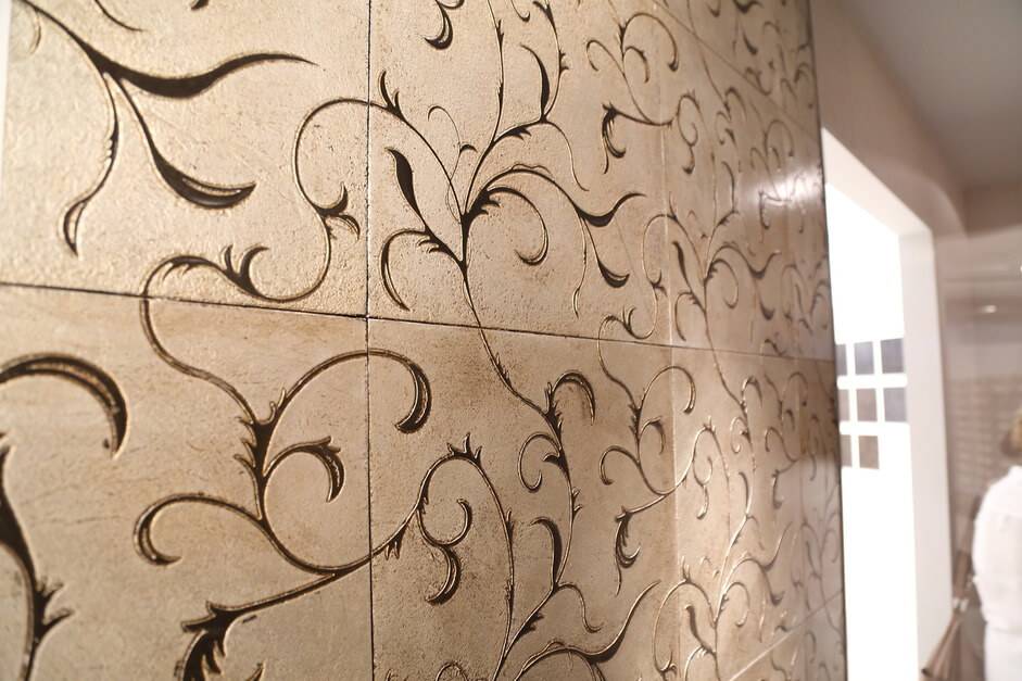 3D-интерьеры с визуальными эффектами для кафе, клубов и ресторанов возможны благодаря плитке с имитацией металла. К ней относятся серебристые, золотистые, выпуклые, шероховатые и даже напоминающие полотна Густава Климта поверхности. Подобные текстуры подойдут для интерьеров в стиле модерн и в современном формате, а также для гламурных санузлов. Это может быть интересно коммерческим объектам, поскольку на плитке с текстурой менее заметна грязь, а производимый эффект поражает воображение. В повседневной жизни такой дизайн может утомить, поэтому для дома лучше выбрать более уютные рисунки.