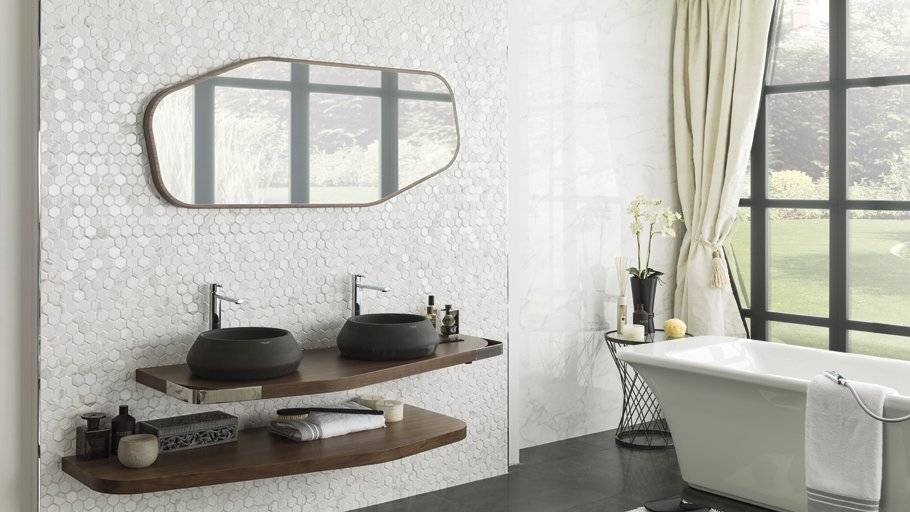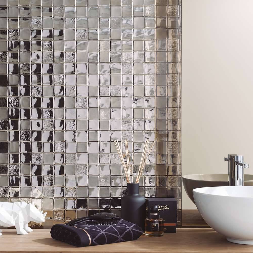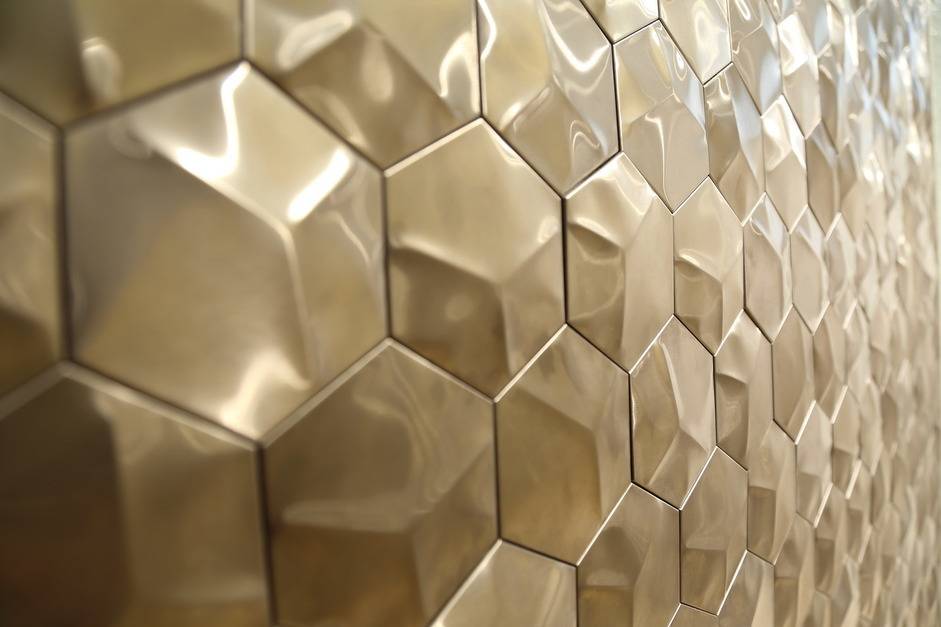 Идее такого открытого дизайна с геометрическими формами и безграничными элементами на основе квадратов, прямоугольников и ромбов следуют мозаика L’Antic Colonial, изделия Thao Verbier от Venis, маленькие треугольники которых достигают до 5 мм в высоту и придают легкости пространству, а также коллекция Steel от Porcelanosa. Металлическая отделка придает помещениям дух артистичности. Это особенно касается Mosaico Stell, которую характеризуют смешанные оттенки и рельефная фактура пересекающихся квадратов.