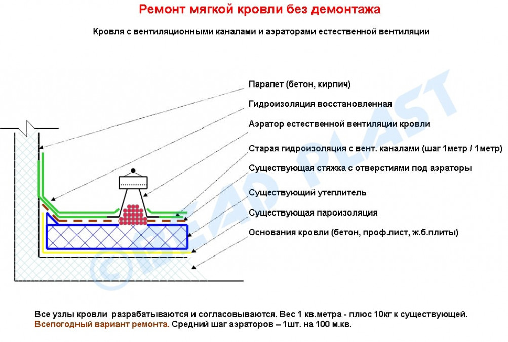 Влажный теплоизолятор плох также тем, из-за него на плоской кровли в летнюю жару появляются пузыри и трещины – все из-за активного испарения воды. В итоге разрушается и кровельное покрытие. А если влага со временем попадает под старую стяжку, тогда вся кровля начинает отслаиваться. Вот почему плоская кровля должна «дышать».