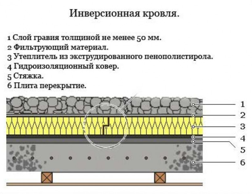Инверсионная | Отличается от обыкновенной расположением слоев кровельного пирога. Гидрозащита делается прямо на несущем основании, такая особенность предохраняет покрытие от механических повреждений. Поверх гидрозащиты укладывается геотекстиль, экструдированный пенополистирол, еще слой геотекстиля и балластный слой. Геотекстиль пропускает воду к сливной системе, а балласт предупреждает подрыв слоев сильными порывами ветра. |