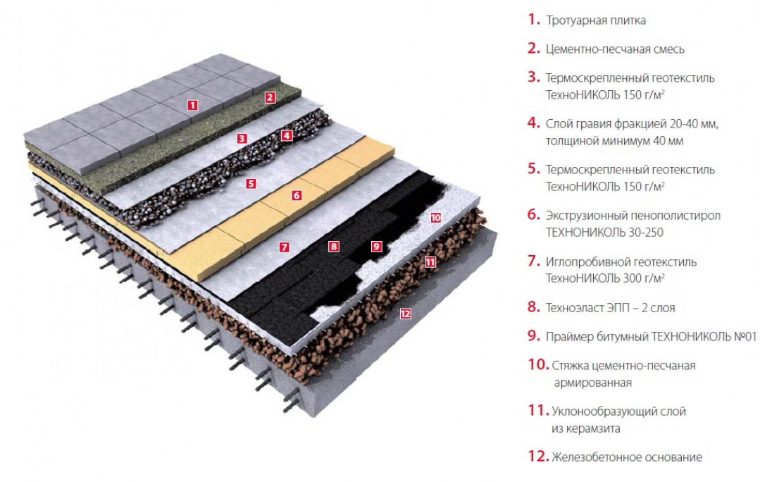 Схемы конструкций эксплуатируемых плоских крыш