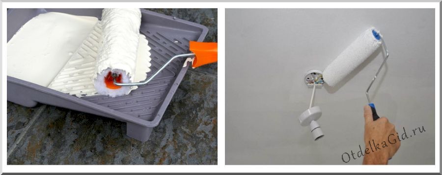 При работе валиком желательно использовать малярный лоток (кюветку), с ее помощью удобно отжимать краску, в противном случае на потолке будут оставаться потеки