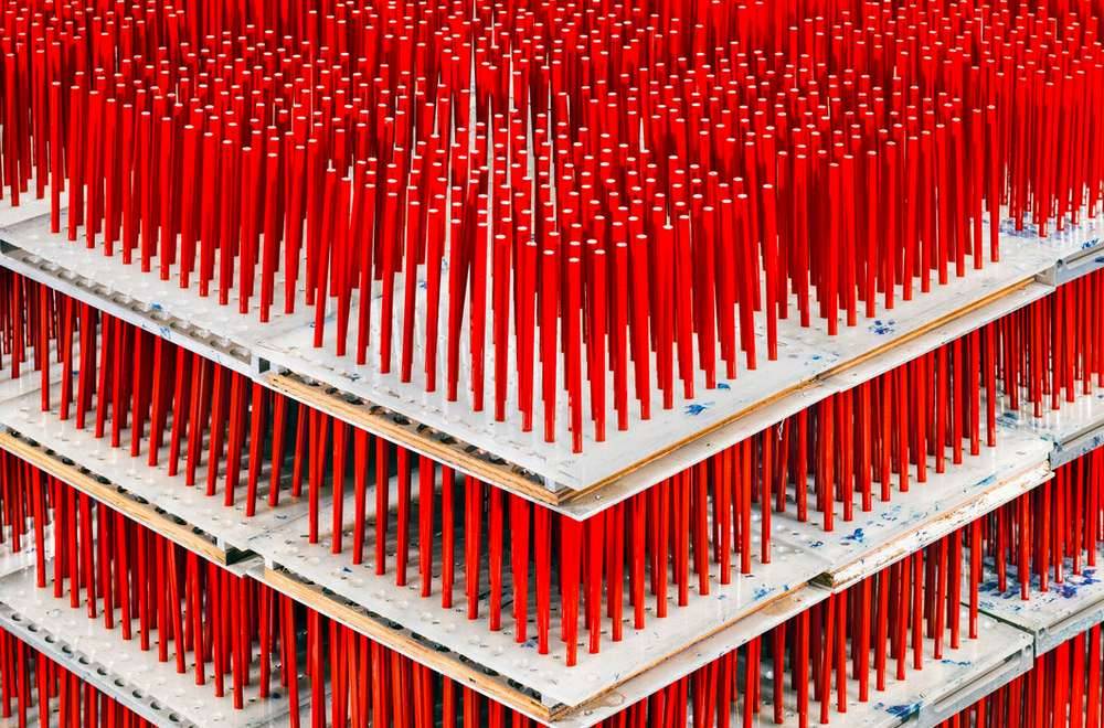 Осталось доделать торцы, они несколько раз окунаются в специальный состав, это делается не вручную, а на оборудовании. Практически готовые карандаши устанавливаются вертикально на платформу, зачем машина начинает окунать их в состав.
