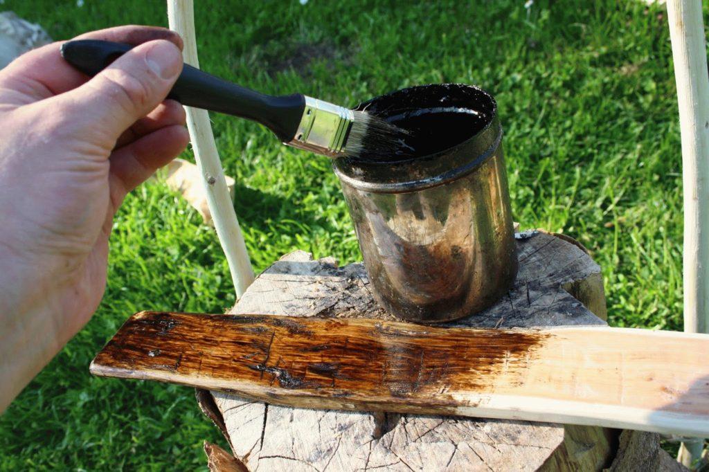 Работать с дегтем было достаточно сложно, смесь практически не отмывалась от древесины и оставляла липкие следы.
