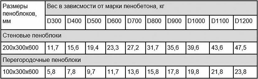 Вес конструкционных и перегородочных пеноблоков в зависимости от плотностиИсточник de.decorexpro.com