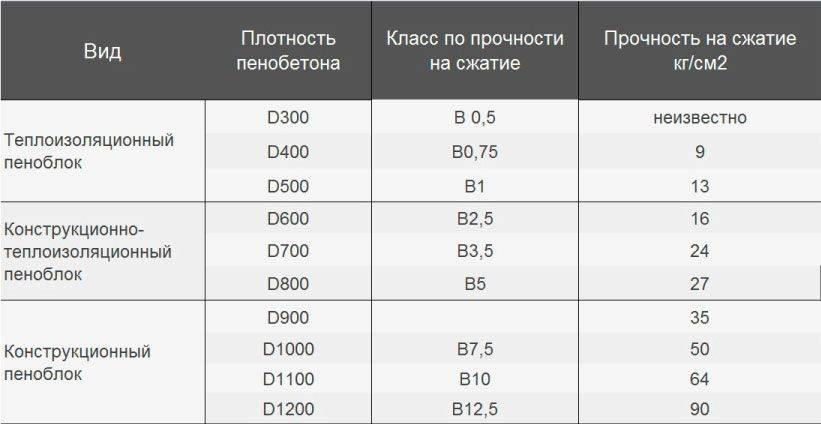 Классификация предусматривает следующее деление пенобетона на разновидности в зависимости от плотности материала: