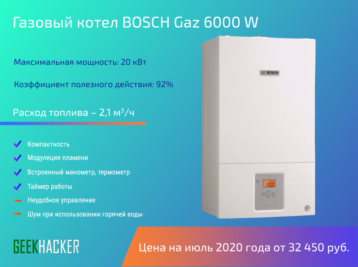 Репутация аппаратов данного производителя проверена годами. Котлы Bosch способны обеспечивать тепло в доме, независимо от возможных перепадов напряжения в сети. К основным преимуществам оборудования можно отнести простое управление и ряд полезных возможностей. Среди таковых имеется способность функционирования во время перебоев давления газа и воды. За счёт малых габаритов и сдержанного дизайна котлы подходят под любой интерьер. В агрегатах есть возможность подключения к системе «теплый пол». Во всех моделях производителя имеется встроенный трёхскоростной насос, с помощью которого производится непрерывная циркуляция жидкости. Управление в системе обеспечивается благодаря многофункциональному дисплею. Перед поступлением в продажу каждая модель проходит специальную проверку и тестирование, что в будущем даёт гарантию на безопасное и надёжное использование.