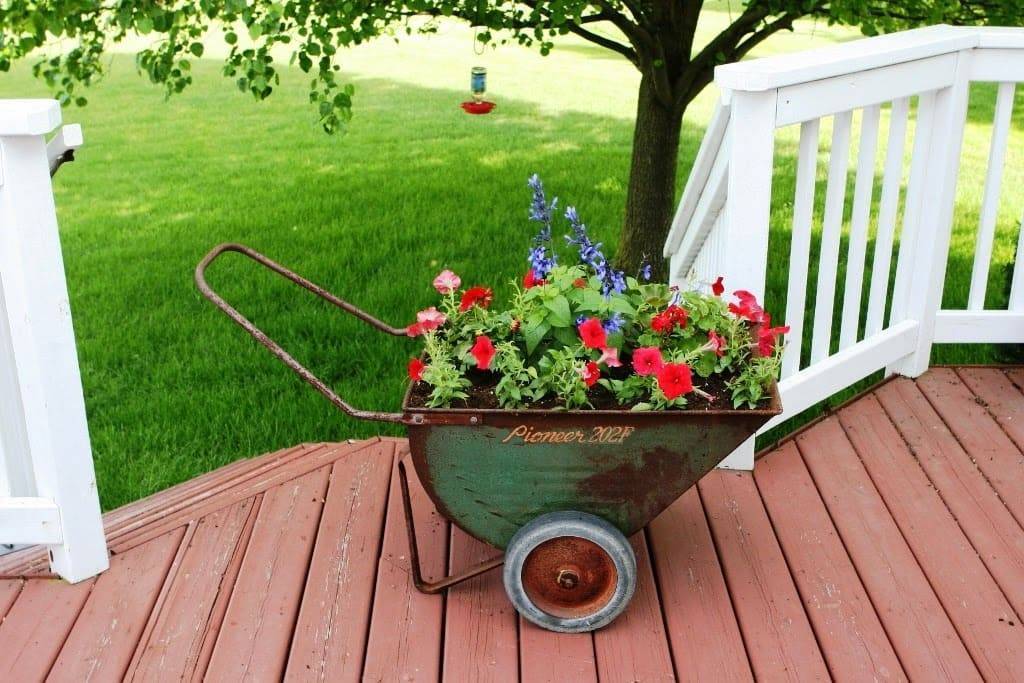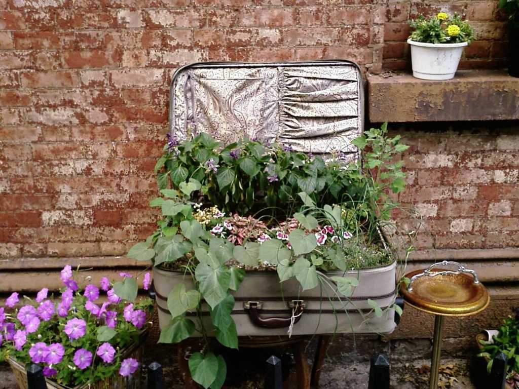 Если в сарае завалялся старый письменный или туалетный столик, его тоже можно использовать в качестве необычной клумбы. Только предварительно придется покрыть его толстым слоем краски или лака, иначе красивая поделка прослужит недолго.