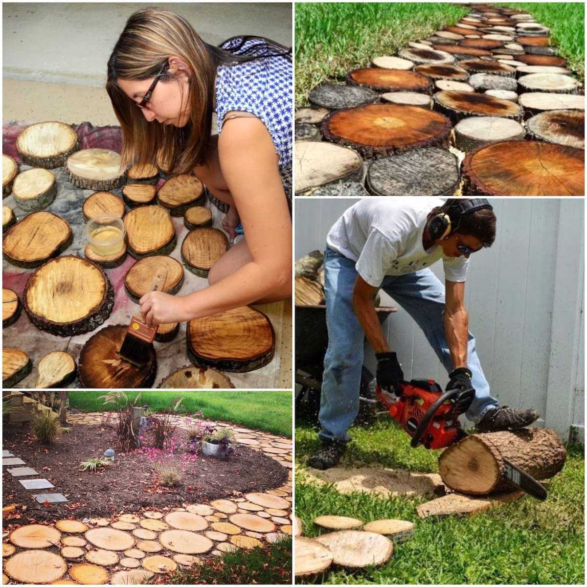 Для дачи из спилов дерева можно создать множество оригинальных поделок, элементов декора или ландшафтного дизайна. Среди интересных идей — вазоны для цветов, мощение для дорожек