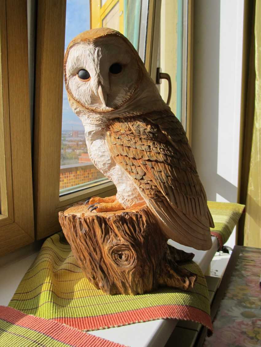 Очень красивыми получаются фигурки животных или птиц, сделанные из дерева. Чаще всего на приусадебных участках можно увидеть сову, являющуюся символом мудрости. Особо эффектно смотрится такая поделка из бревна, так как древесный рисунок будет отлично имитировать перья совы. Наиболее интересно получается фигурка совы с круглыми глазами, сидящей столбиком или с распростертыми крыльями. Но такие поделки требуют большего опыта работы с деревом. В качестве дополнительного украшения изделие покрывают лаком или краской.