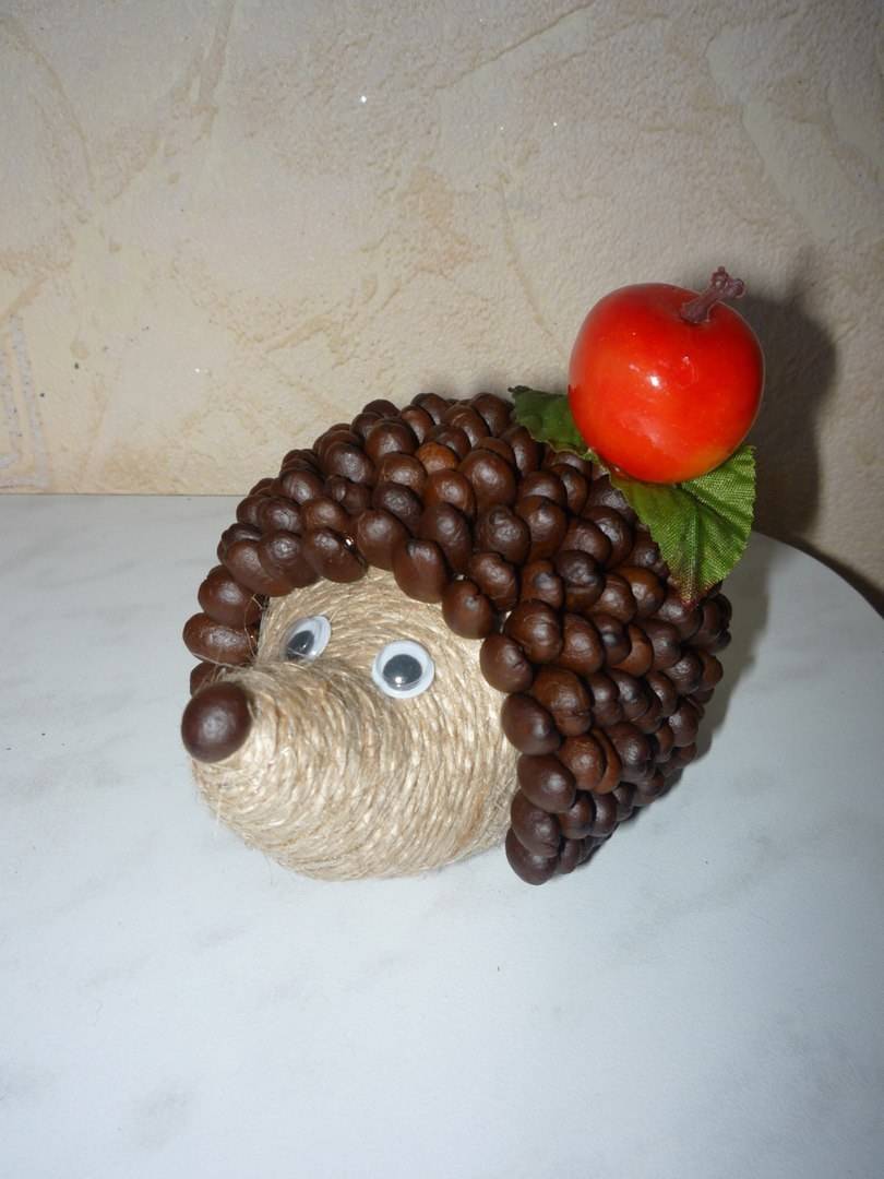 • В отличие от большинства других поделок из кофейных зерен, у ежика декор будет приклеиваться в вертикальном положении, а не в горизонтальном. Карандашом начертите линию по пластику, которая проходит строго по его центру. Закрепите кофе на отметке. При этом плоская часть зерна должна быть повернута в сторону мордочки.