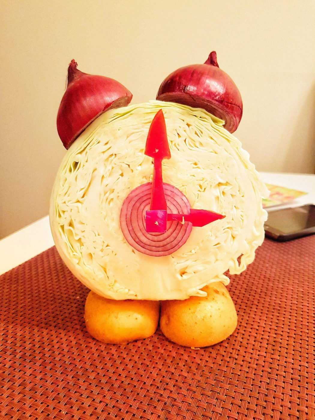 Самая простая идея и легкая, так это корзинка с такими персонажами. Как видите, автор использовал массу овощей, которые есть в любом доме.