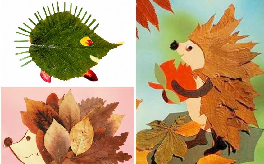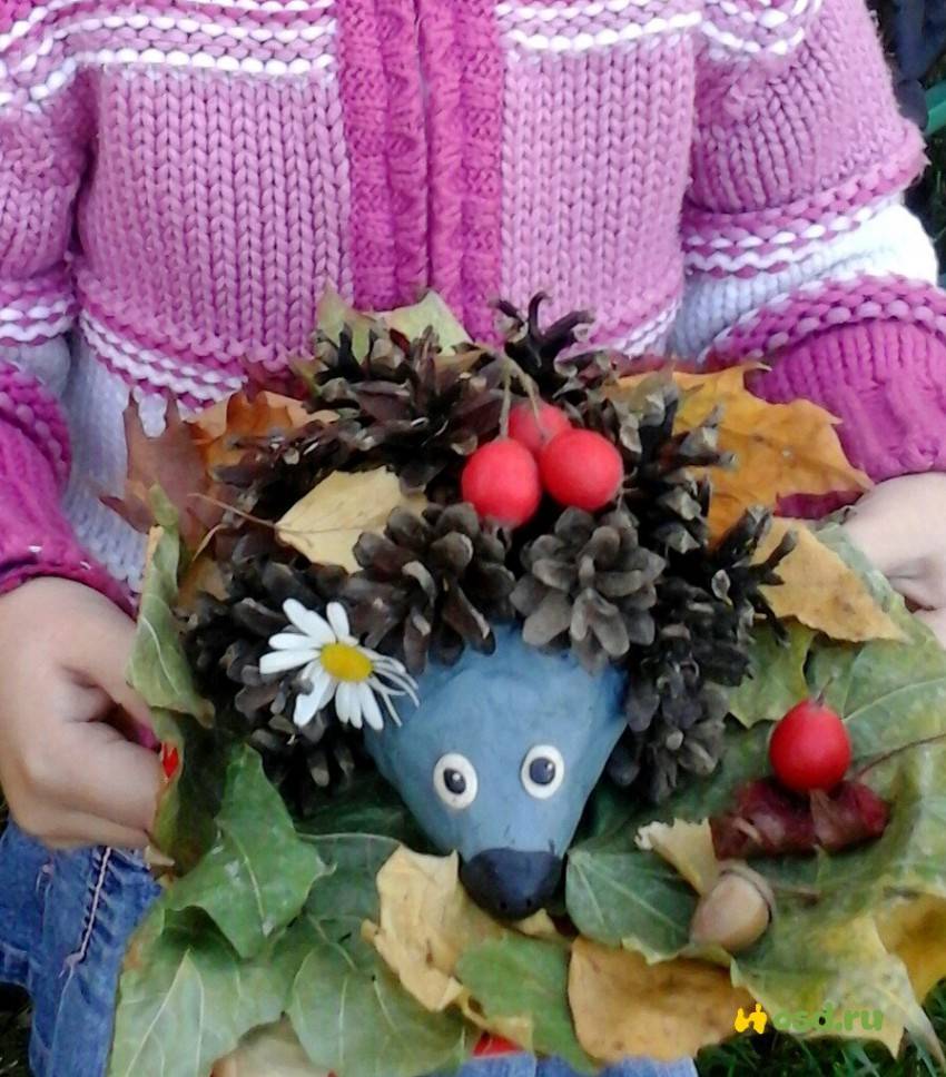 Прекрасно смотрятся осенние поделки, выполненные из природного материала. Любимый малышамиперсонаж многих мультфильмов Ёжик, его легко сделать из желто-рыжих сухих листьев.