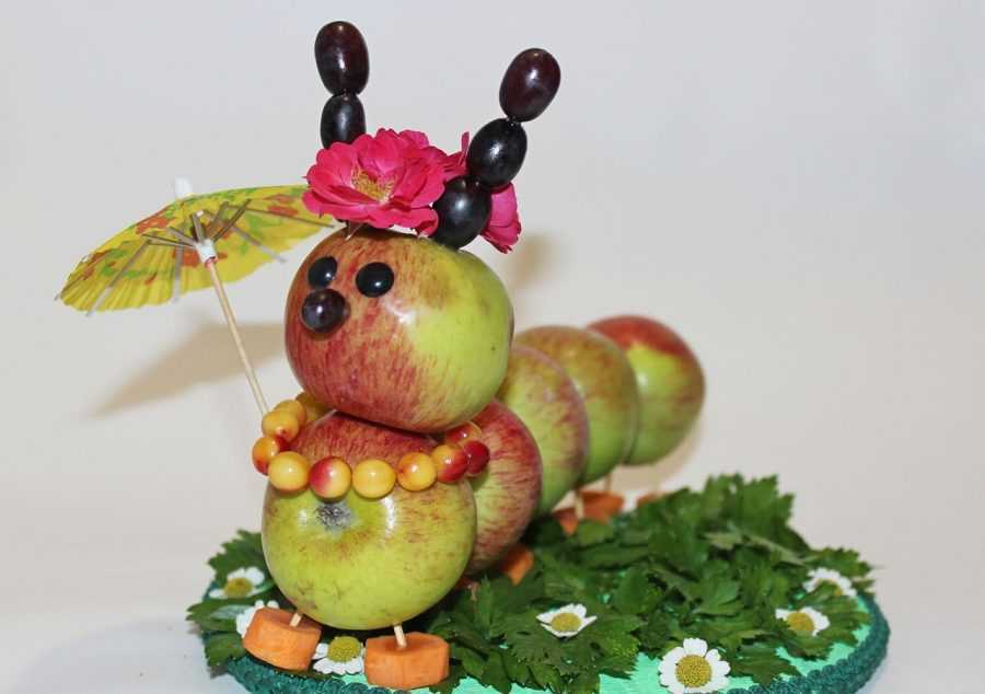 Вы можете взять абсолютно любые овощи и фрукты и из них соорудить любых героев или композиции.