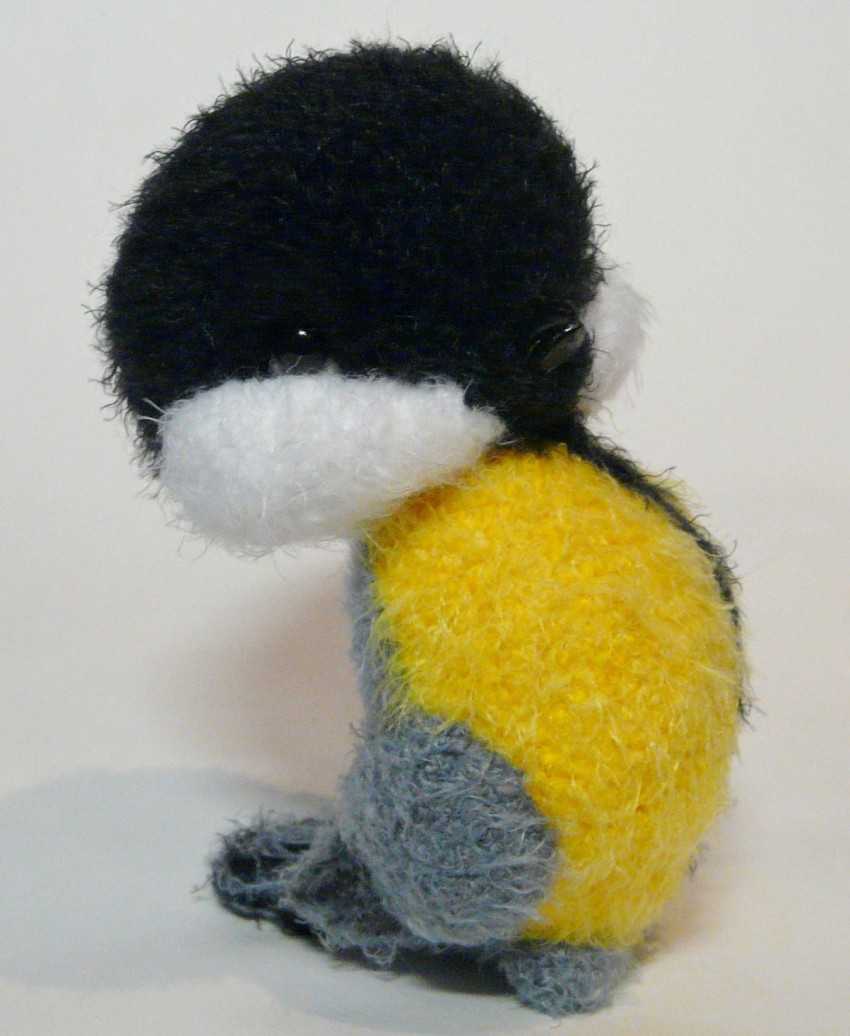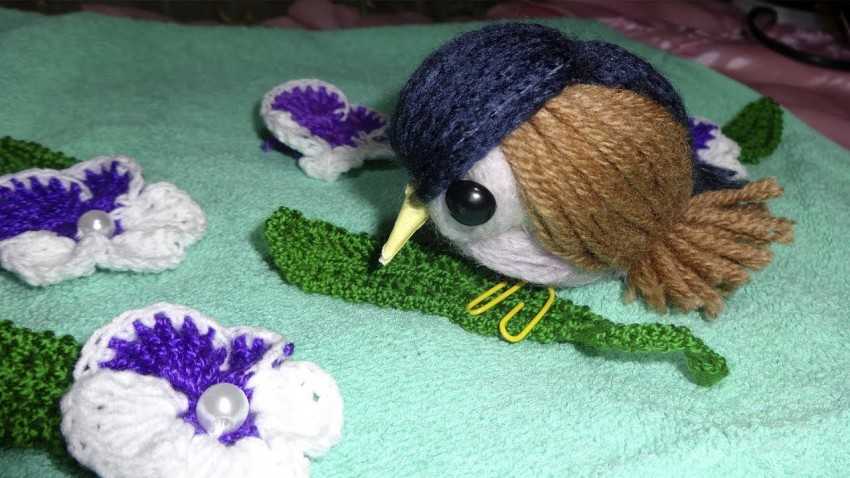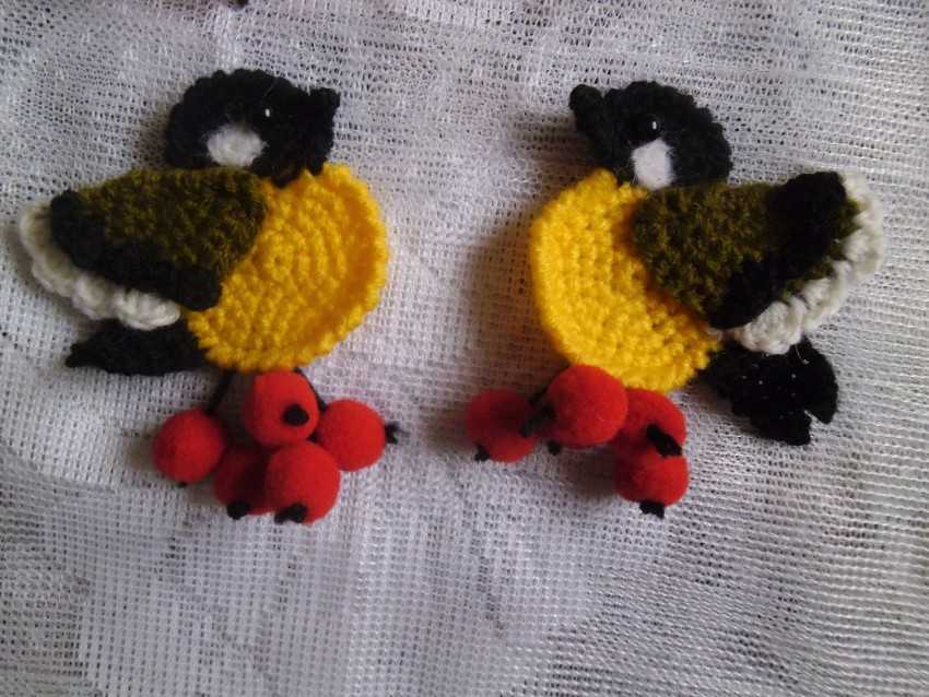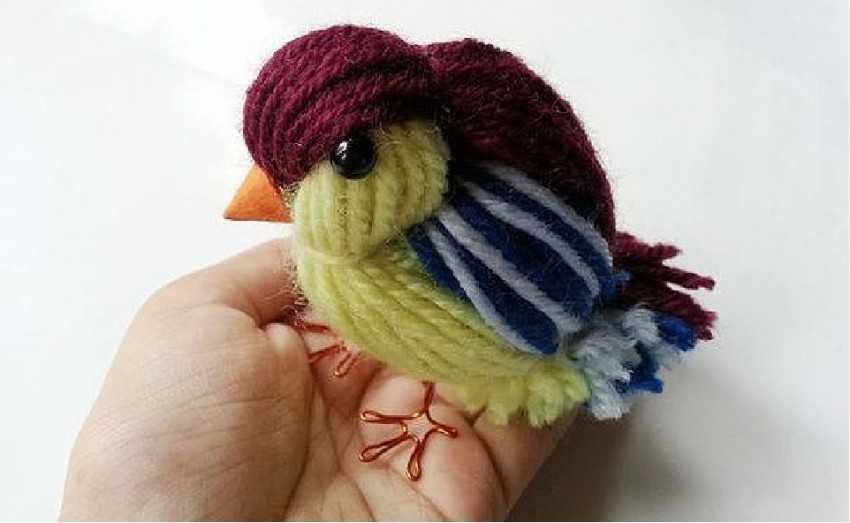 В этой же технике можно выполнять поделки из шерстяных ниток в виде разных птиц. Для изготовления синицы понадобятся: разноцветная пряжа, ножницы, 2 картонные основы шириной 9 см и одна 12 см, проволока для лапок, изолента, картон, клей.