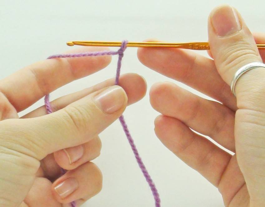 Основа начинается с создания петли на кончике рабочей нити. В эту петлю справа налево вводят крючок, захватывают нить, продергивают.