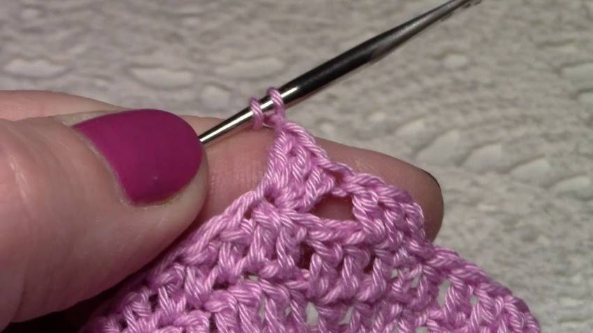 Столбик делается из двух петель одновременно: рабочей и воздушной, вытянутой из кромки соседней. Нить продергивается одновременно через обе, образуя перехлест на невысокой ножке.