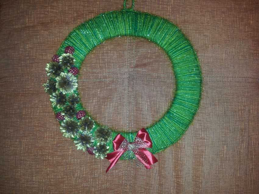 Обматывать венок нужно со всех сторон. Украсить готовое изделие можно цветами, шишками, каштанами и желудями. Можно купить игрушки из пенопласта или изготовить их из ниток самостоятельно.