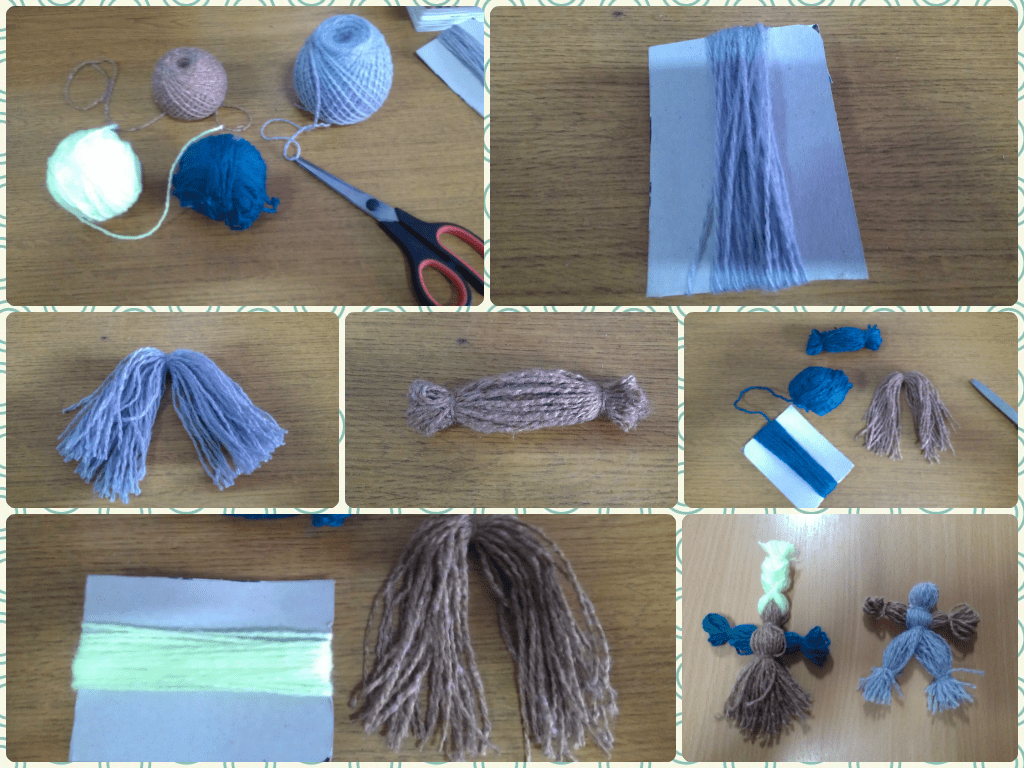 - Намотайте бежевую и сине-голубую пряжи на две заготовки по 9 см, разрежьте