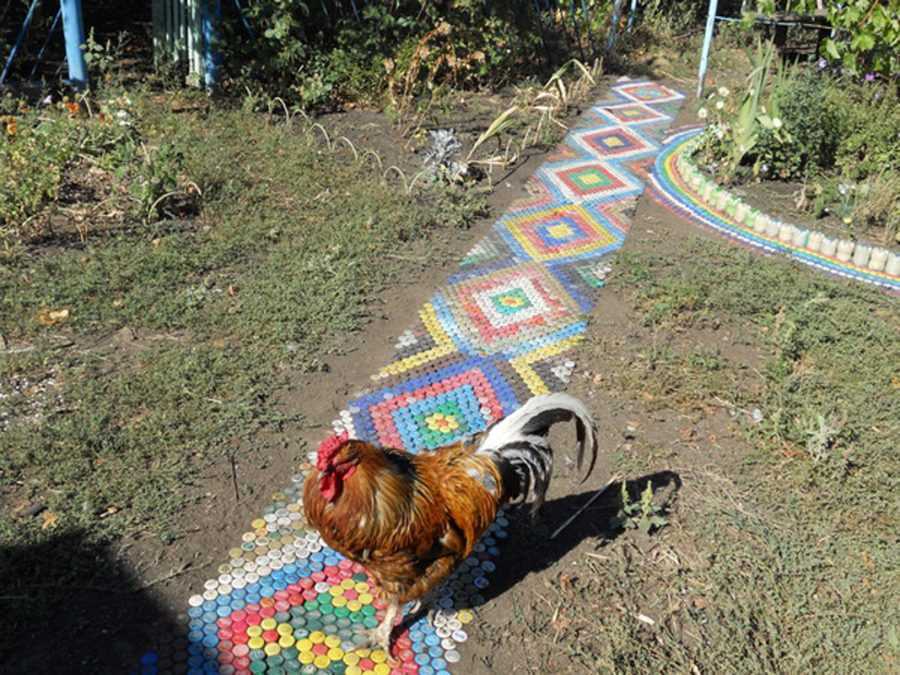 Сухие, не подвергающиеся подтоплению участки находятся в самом выгодном положении, ведь их дорожки можно оформить настоящими мозаичными картинами, созданными с помощью цветных крышек от пластиковых бутылок. Ступив на них, ваши гости непременно воскликнут: «Боже! Какой Версаль!»