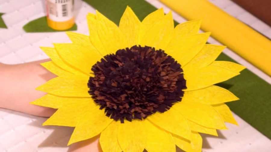 Нанести клей в центре круга, после приклеить самые большие лепестки ближе к середине по окружности. При приклеивании у основания каждого лепестка делается гармошка.