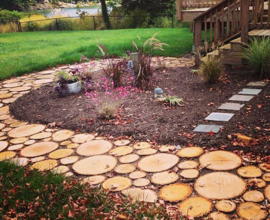 Изготовленная с помощью формы и бетонной или цементной смеси самодельная тротуарная плитка обеспечит максимальный комфорт. Но ее с успехом могут заменить деревянные спилы: выстеленная ими дорожка тоже красива и удобна.