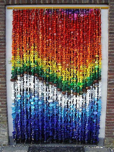 Ещё одна поделка из крышек от пластиковых бутылок – занавески на дверь. Впрочем, их можно использовать и для зонирования пространства. Они подойдут к любой комнате. Можно повесить такие шторы и на террасе. Разноцветные и яркие они будут поднимать вам настроение каждый день.