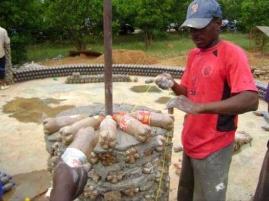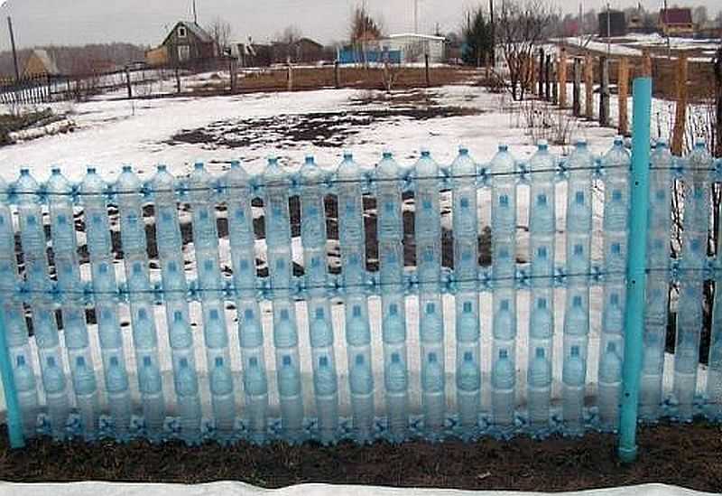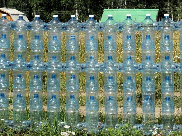 Легко и достаточно быстро можно сделать на своем дачном участке забор. Для этой цели у бутылок отрезаются донышки, затем одна бутылка вставляется в другую. Так делаем столько бутылок, на какую высоту необходимо поднять забор. Для самого забора на равном расстоянии устанавливаем столбы, между которыми протягиваем проволоку. Протягиваем ее как сверху, так и снизу. Теперь осталось собранные колонны из бутылок прикрепить к проволоке. В результате получаем готовый забор.