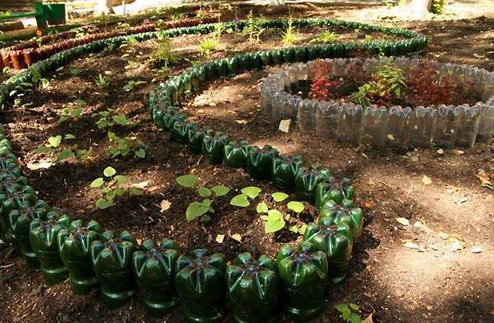 Особенно этот материал любят дачники. Садоводы и огородники. Очень часто заглянув на чей-нибудь дачный участок можно увидеть разрезанные пополам и выложенные в круг или прямоугольником друг за другом перевёрнутые низа пластиковых ёмкостей. Самый простой способ декоративной отделки цветочных клумб и грядок.