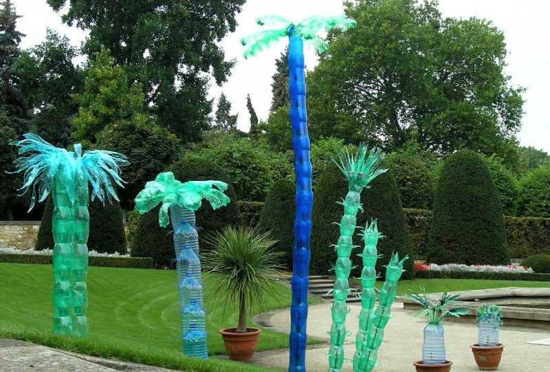 На участке можно соорудить дерево или же просто цветы, которые зимой и летом будут одним цветом. Такие поделки будут радовать глаз человека, а также такие деревья можно сделать музыкальными. Например, можно сделать пальму или иву, главное, чтобы у дерева могли свисать ветви, на которые и стоит прикрепить колокольчики, ракушки, различные стеклышки и когда ветер будет развивать ветви дерева, то будут исходить различные красивые звуки, это подобно “музыке ветра”.