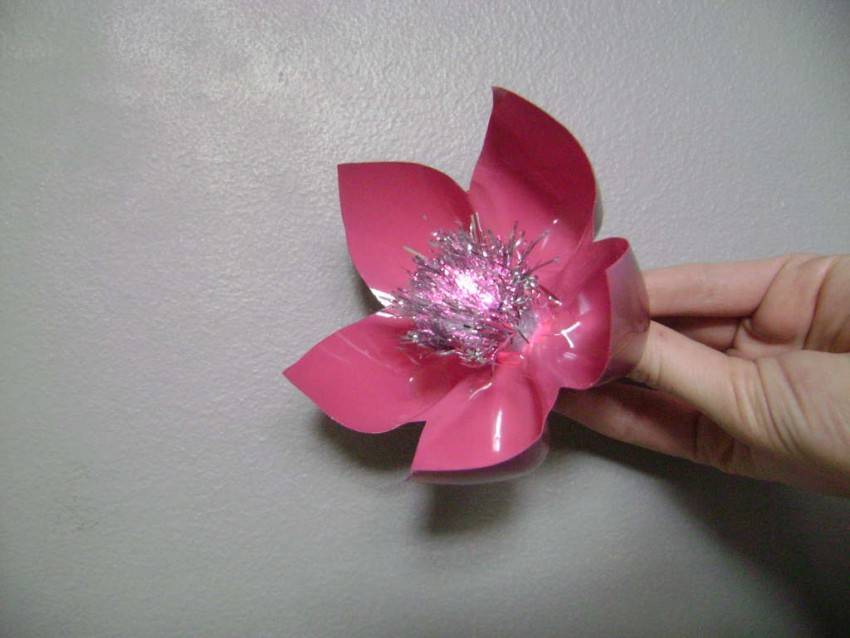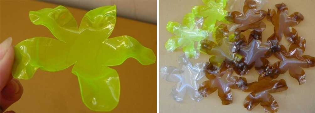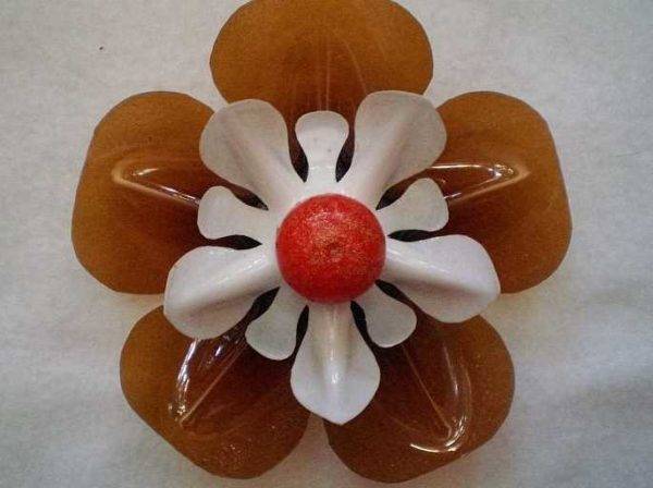 Вы, наверное, замечали, что донышко ПЭТ бутылки похоже на цветок. Все что надо сделать — найти бутылку красивого цвета, отрезать у неё донышко. Вот у вас уже и получился симпатичный цветок. В серединку можно добавить нарезанные из центральной части лепестки, сердцевину из нарезанной лапшой полосы пластика или приклеить внутрь бисер, но обо всём чуть подробнее.