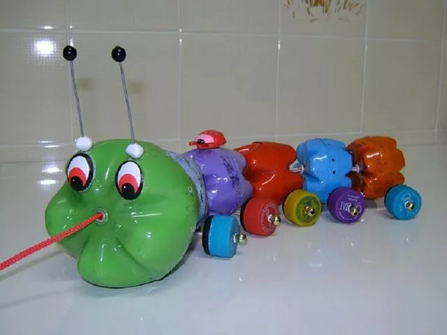 Например, можно смастерить такую вот гусеницу. Для нее используются донышки пластиковых бутылок.