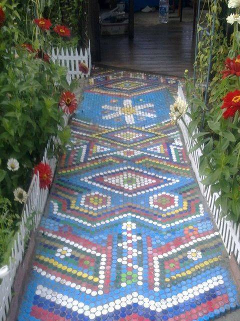 Выкладывают из крышек и садовые дорожки. Такие тропинки получаются невероятно яркими и жизнерадостными. Особенно красиво смотрятся они поздней осенью.