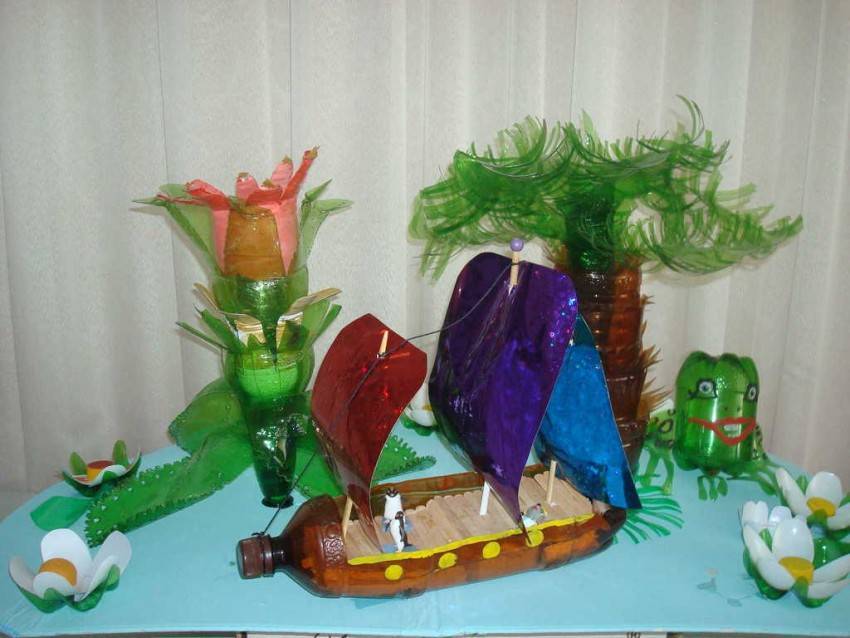 А можно сделать из бутылки яхту, которая будет не просто стоять на полке, а плавать по воде, радуя не только детей, но и взрослых. Как сделать такую яхту, рассказывается в приведенном ниже видео.