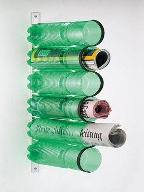 Такой вариант: берем пластиковые бутылки, отрезаем от них горлышко, оставляя только нижнюю часть. Размер зависит от того, что вы собираетесь держать на этих полках. Берем металлическую планку и прикрепляем к ней шурупами бутылки. Останется прикрепить саму планку к стене – и полочка готова.