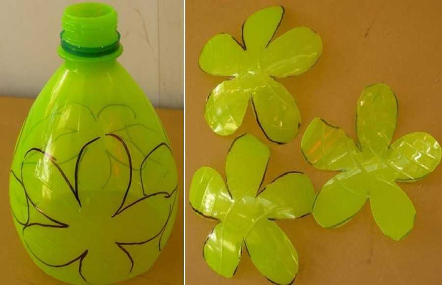 Берем бутылку, на ней рисуем маркером контуры цветка. Рисовать можно на любой части. Просто лепестки будут изогнуты в разной степени.