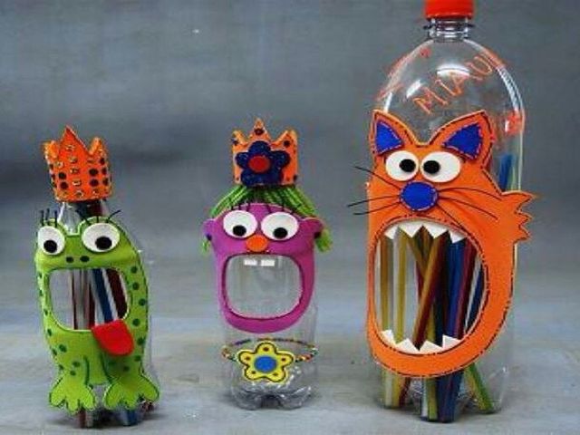 О том, что пластиковые бутылки хорошо подходят под карандашницы, и говорить не приходится. Самый простой вариант: разрезаем бутылку пополам, разрисовываем – и вот вам, карандашница готова. Но можно сделать и несколько по другому. Вырезаем в целой бутылке овальное отверстие, рисуем мордочку какого-либо животного с раскрытой пастью, наклеиваем на вырезанное отверстие. В результате получаем такую вот оригинальную карандашницу.
